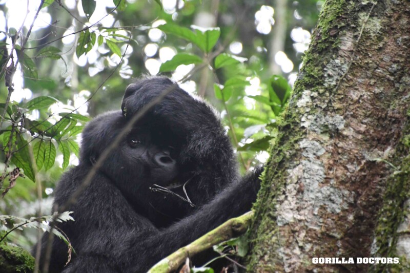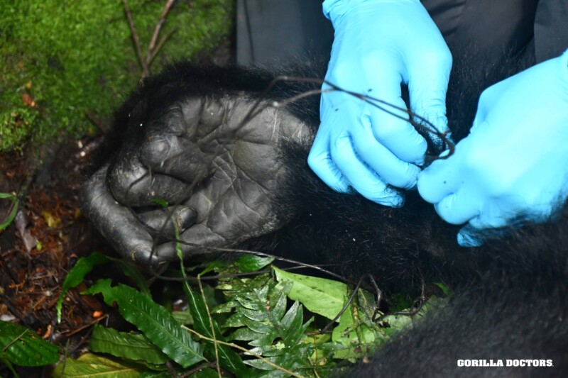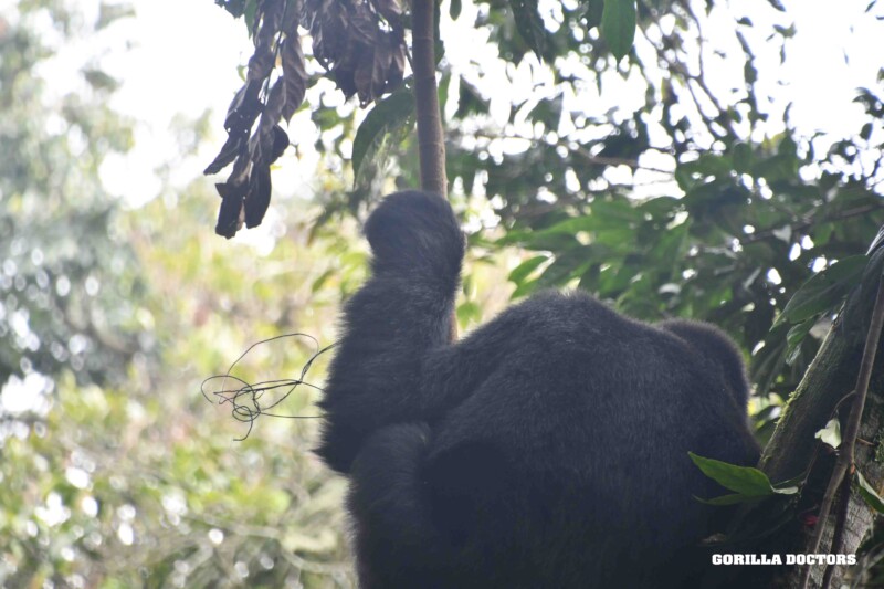 On the afternoon of Thursday June 5, Bwindi Impenetrable National Park trackers reported that blackback mountain gorilla Karureeta of Katwe group had a wire snare around his left wrist. The snare was affecting his mobility, and he was exhibiting signs of discomfort.
